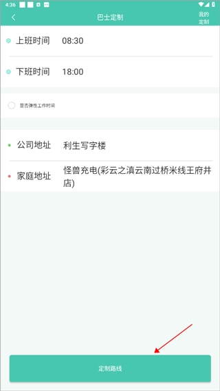 2、进入界面后,选择你的上班与下班时间,再填写家庭和公司的地址,就能完成路线定制了。