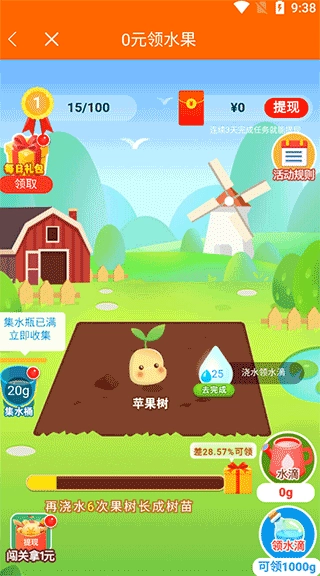 3、点击主界面上方绿色方框里的按钮,进入领水果的界面;