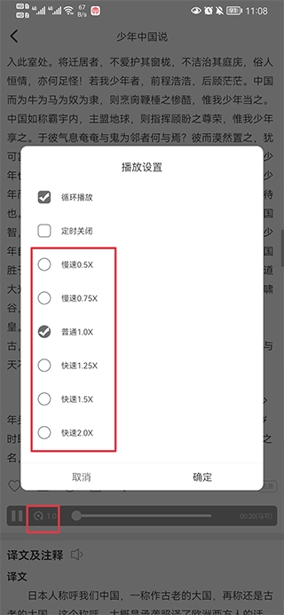2、在进度条里点击1.0的位置,接着就能调节到自己想要的倍速了