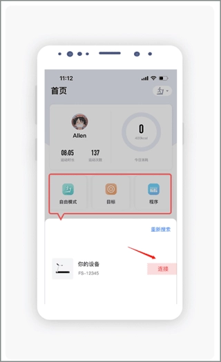 4、选择模式连接设备:先挑选任意一种运动模式,点击“开始”按钮后,再进行设备连接操作。