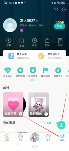 1、进入5sing原创音乐平台后,第一步先点击页面右下角的“我的”选项,接着再点击右下方的“↑”按钮。