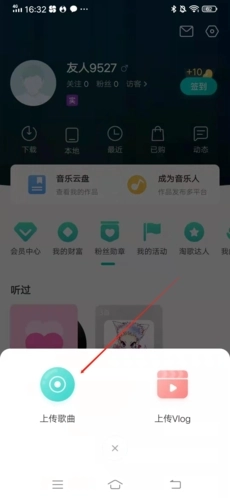 2、在弹出的窗口里,点击“上传歌曲”;要是需要上传的是视频,也可以选择点击“上传Vlog”。