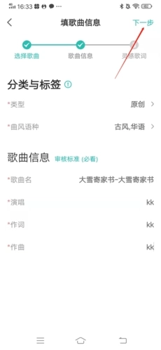 4、把该作品的各类相关信息完整填写进去,检查确认没有问题后,点击右上角的“下一步”按钮;