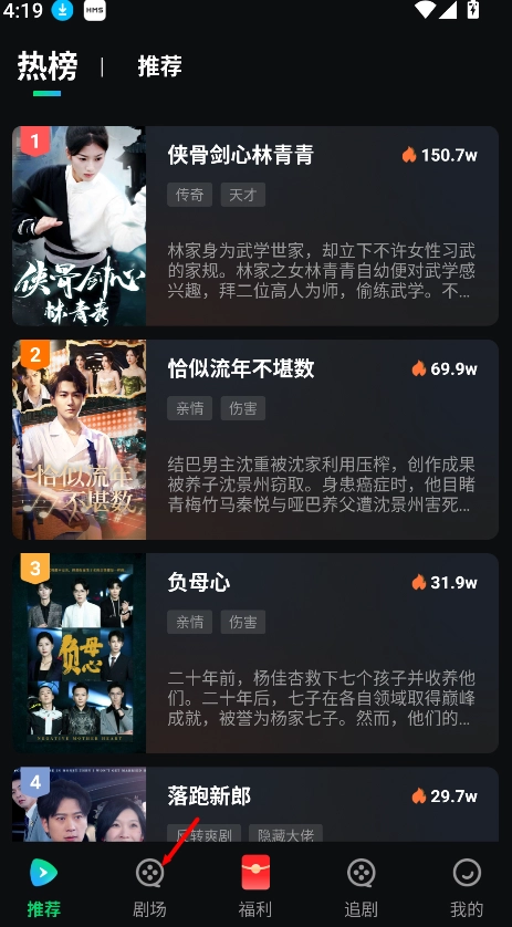 1、打开已安装的山海短剧应用,点击首页底部的“剧场”入口,就能进入汇聚了所有短剧资源的集中展示页面。