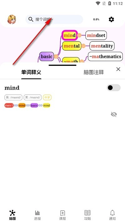 3、进入首页这里有搜词和脑图,在输入框输入单词。