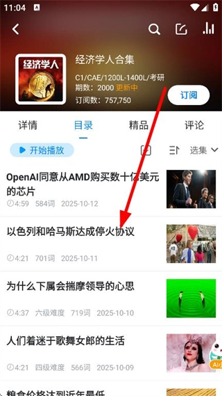3、进入经济学人合集详情页后,找到你想学习的文章并点击,即可进入该文章的学习页面。