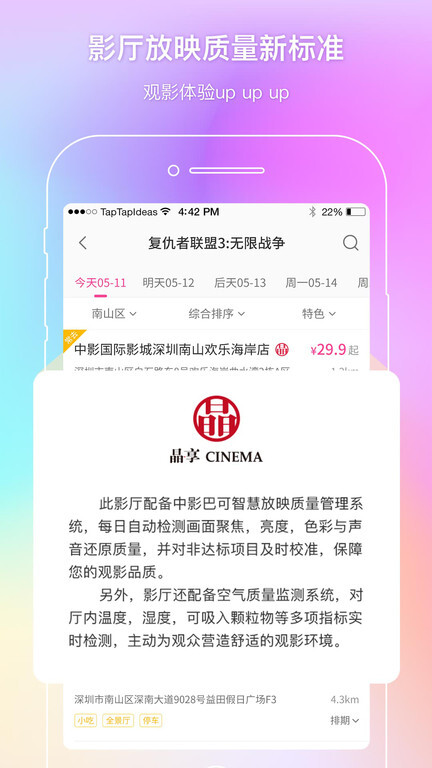 3、定位查找:借助GPS功能,系统能够自动定位到距离您最近的中影国际影城,为您的出行规划提供便利。