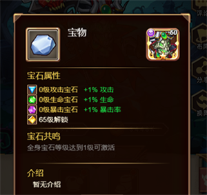 最后说下宝物,宝物分为六种形态,一次为:白,绿,蓝,紫,橙,红,宝物有4个镶嵌孔,通过填充对应种类的宝石(4种宝石),可对宝物进行该属性的升级。4种属性中的最低等级为宝物的共鸣等级,共鸣等级越高,可激活更高形态的宝物,所获加成属性能力越高。