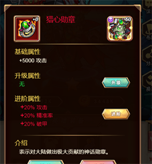 其次是勋章,勋章的培养分为升级和进阶,只有高品质勋章(紫,橙,红三类勋章)才可以进行进阶,和装备不同,勋章的升级和进阶材料均为勋章,通过吞噬其它勋章进行勋章的升级或者进阶。