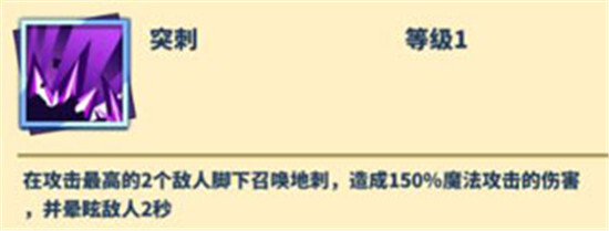 向攻击最高的两个敌方召唤地刺,造成伤害和眩晕。