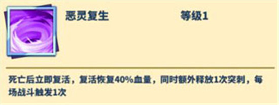 这个技能可以很好的提高暗魔的坦度,一个拥有两条命的前排四舍五入相当于多上了一个人。另外,这个技能在冒险、神魔试炼等活动中有着出色的表现,即使在暗魔中途阵亡,但下一次战斗暗魔又能够刷新复活效果,也就是说只要暗魔不在一场战斗中阵亡两次,那他就不会倒下。