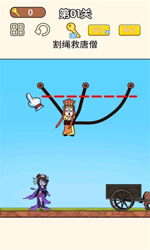 在游戏里,玩家需要到河里去切割绳子,从而解救被困住的唐僧。