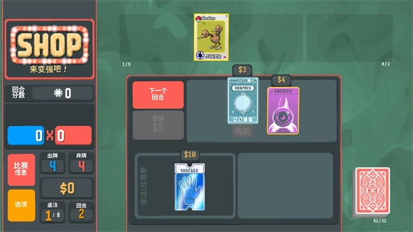 5、通关之后会进入商店界面,你可以用之前获得的金币解锁新的小丑牌和道具牌。