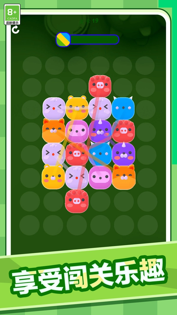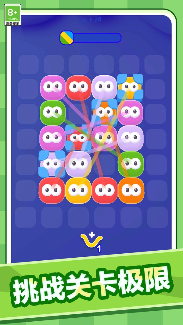 1. 画面上方呈现当前关卡的进度条,每完成一次配对操作都会增加进度,当进度达到要求后就能进入下一个关卡。