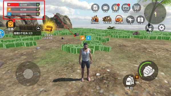 3、左上角的三个颜色条分别是生命值、饥饿值、水分,保持足够的数值才可以正常生存。