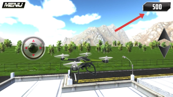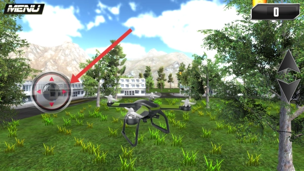 1、需借助左侧的四向方向盘操控无人机在草地场景中完成起飞与转向动作,以此熟悉无人机的飞行操作。