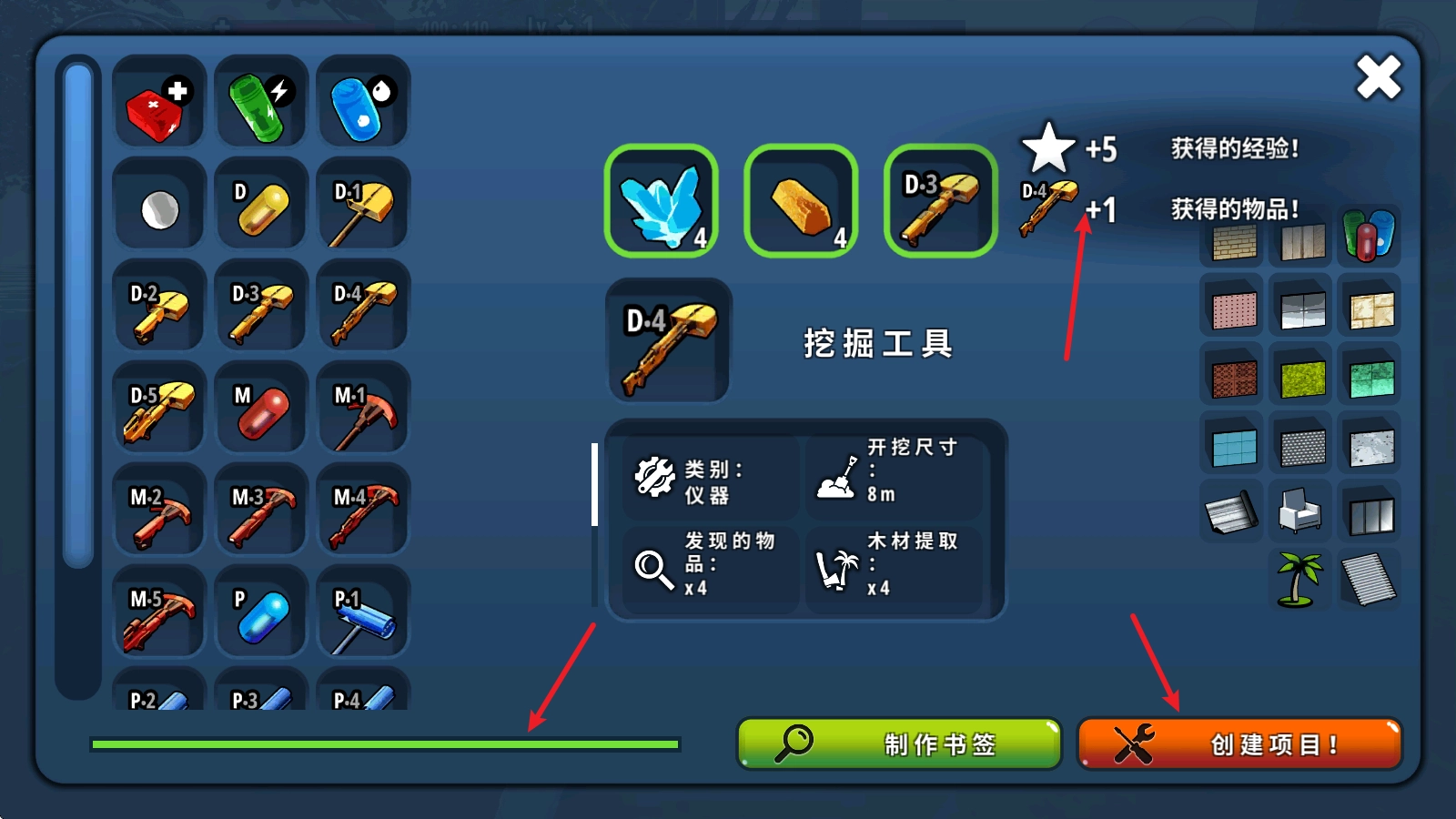 6、点击右下角的“创建项目”按钮后,系统会消耗对应的材料启动制作流程;当左下角的进度条加载完毕,即可获得相应物品和经验。