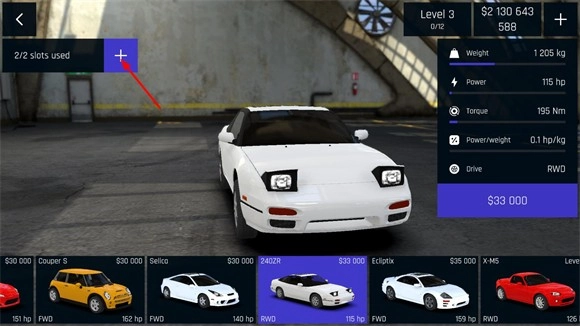 4、要是没办法购买车辆,可以点击左侧的+号来增加车库的位置,解锁新的车位之后就能接着购买车辆了。