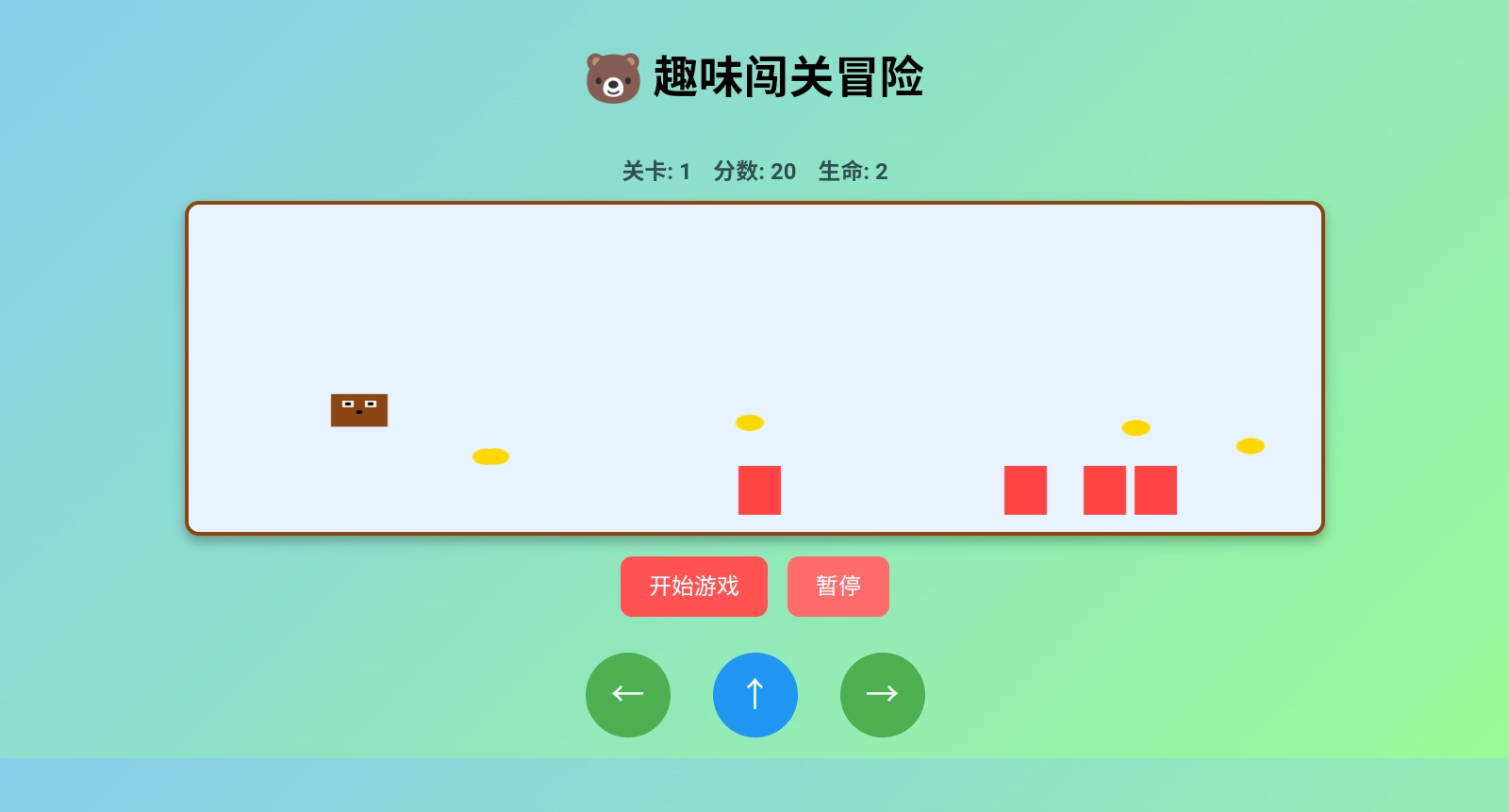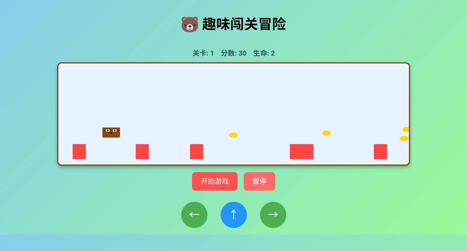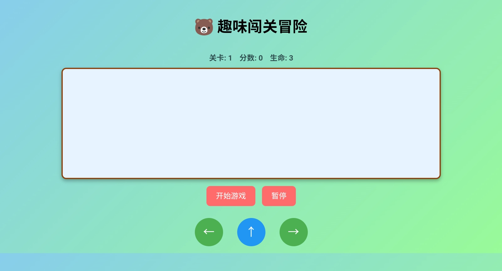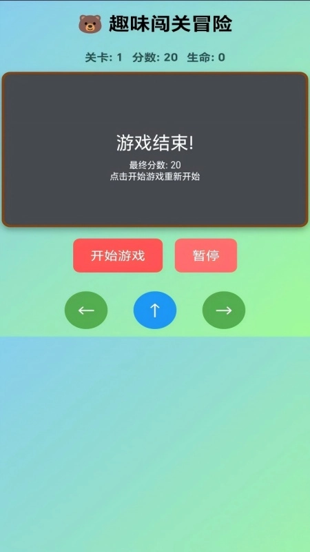 2、游戏中有共有左←、上↑、右→三个按键,分别是往前、往后、跳跃操作(单指点击屏幕控制力度)