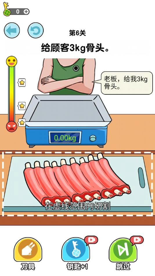 3、努力闯关,没什么难度,只要完成称重要求就可以了,多多训练熟能生巧,多了就切,少了就减。