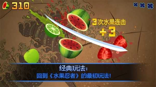 1、令人着迷的水果忍者入门就这么简单!在经典模式中挑战自己,看能坚持多久。