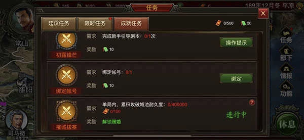 2、过完教程再随便开一局正常的剧本就可以看到右边的任务图标了~里面的限时任务(看广告)还有成就任务,都是后续白嫖的主要渠道之一。玉符广告每天可以看6次,一次4玉符,4*6=24,另外累积看广告还可以完成日积月累的任务,可以获得礼券,礼券可以代替部分玉符功能消费~