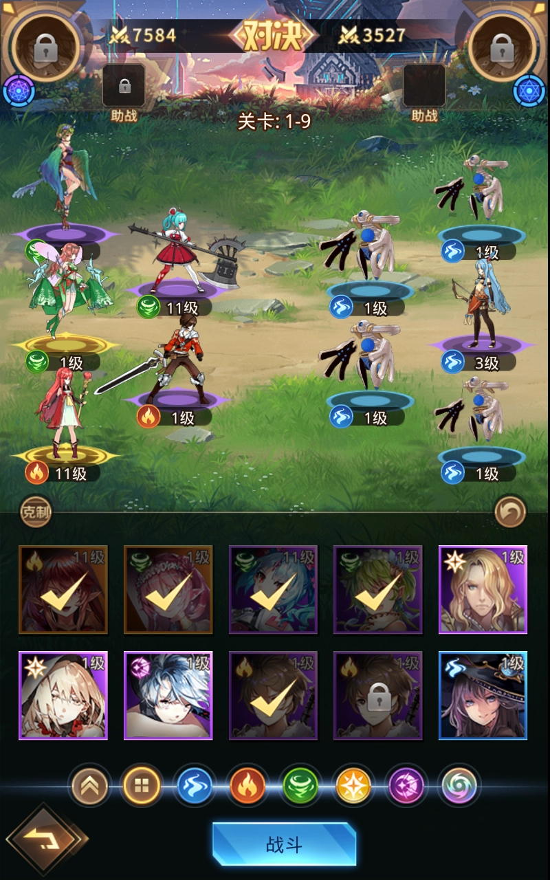 游戏英雄主要分为光、暗、风、火、水五大元素类型,所有英雄均可通过召唤获取。目前含友情、普通、高级和特定四种召唤模式,可通过消耗召唤卷、钻石以及友情点进行抽取,召唤获取的积分到一定数值可在积分召唤获得闪耀传说英雄一名。