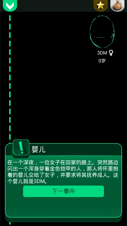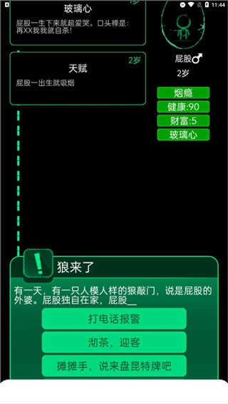 1、游戏采用暗黑色调背景与绿白字体相结合的简约画面风格,没有设置任何需要玩家完成的任务系统,取而代之的是人生不同阶段会出现的各类选择。