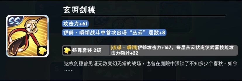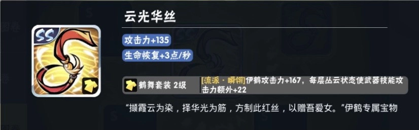 当然还是一个道理,先做剑穗,其余俩宝物哪个图卷多做哪个,伊鹤的套装是会直接增加面板的!