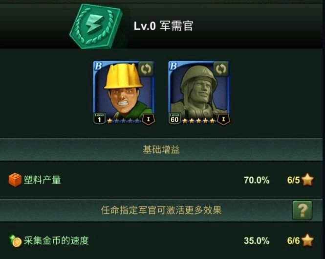 3.军官指挥:通过委任中心-军官指挥可以通过安置军官获得额外的BUFF效果,比如最初的军需官可以提升塑料产量;工兵长可以提升涂料产量、部队负重、资源采集速度;审计官可以提升电能、金属产量与利用率。对于缺资源的萌新来说,推荐优先安置这几个指挥位(^_−)☆