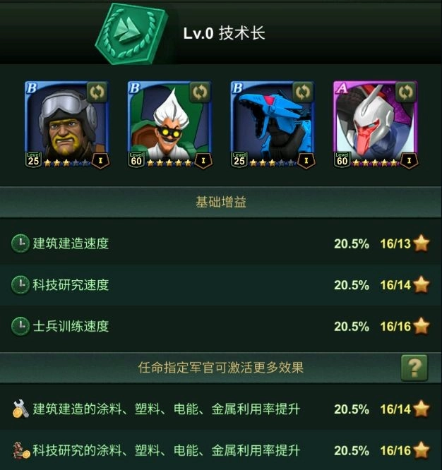 2.军官指挥:之前讲了增加产出的指挥位,这次轮到减少消耗的了!前期最值得一提的是技术长指挥位,我们可以优先凑出14星,来保证建筑与科技的效率提升。