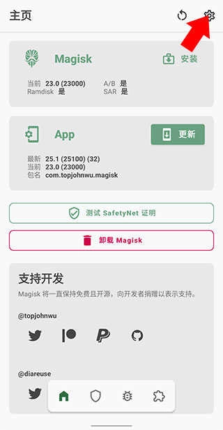 2、接着就是配置屏蔽列表了,与上方24.2版本类似但又有些不同,首先来到Magisk首页,点击上方的设置按钮