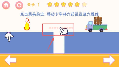 3、接着,用手指在屏幕上点击并拖动来画出路线,引导小卡车把火药运送到火堆所在的位置。