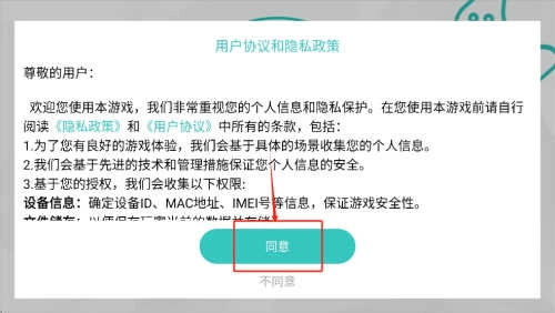 1、首先,请仔细阅读并同意用户协议与隐私政策,随后点击“同意”按钮以继续游戏。