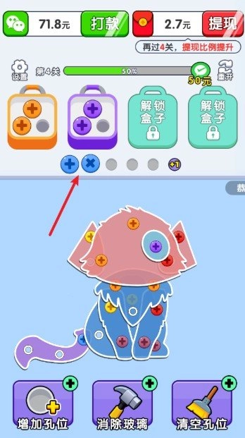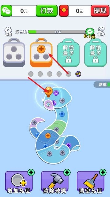 4、把所有盒子都消除掉,将全部螺丝都拆掉之后就算通关,就能领取通关奖励了。