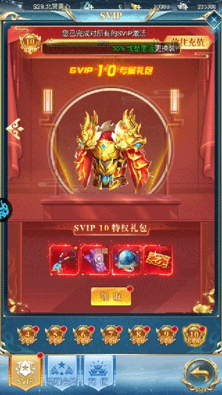 2、游戏上线即送vip10,可以在vip界面免费领取vip1-10级奖励。