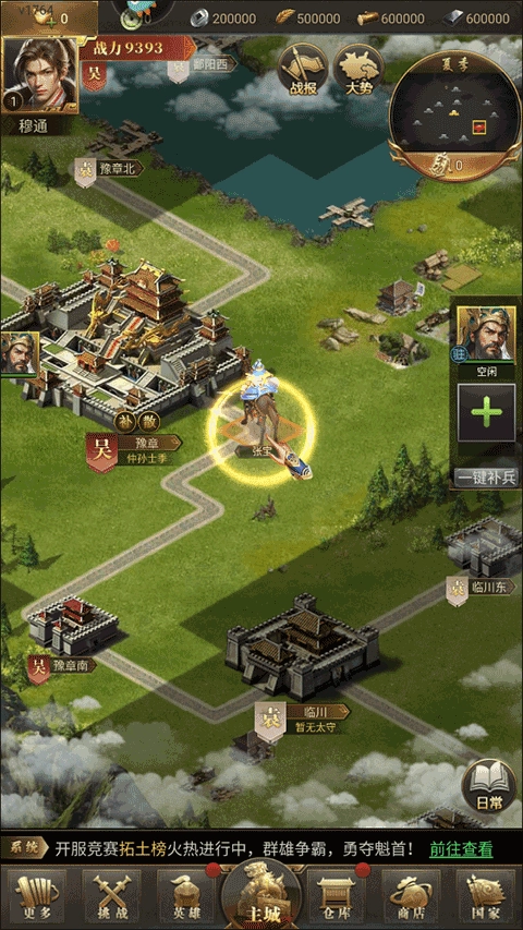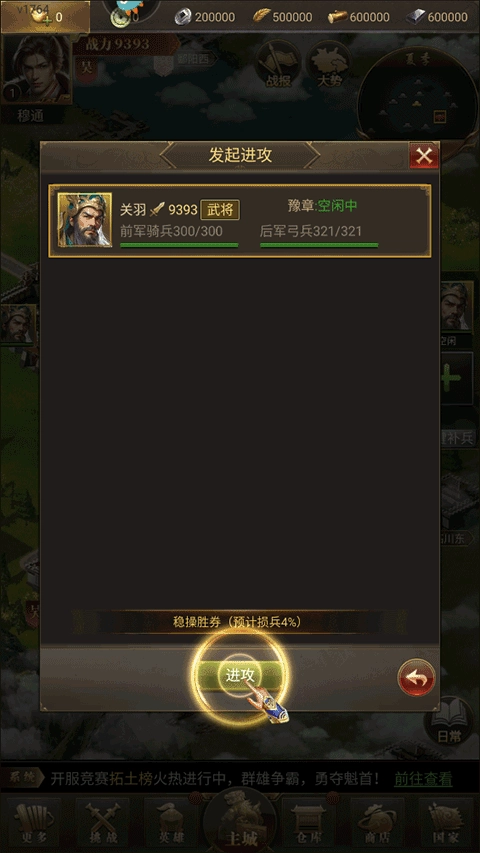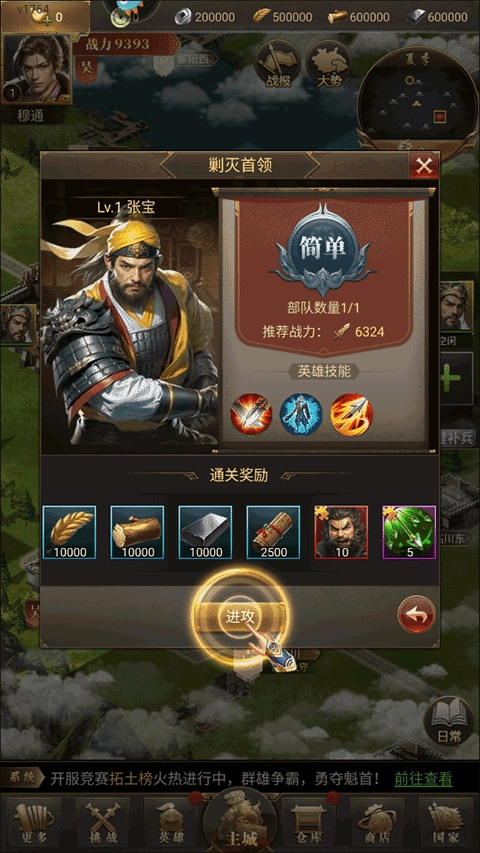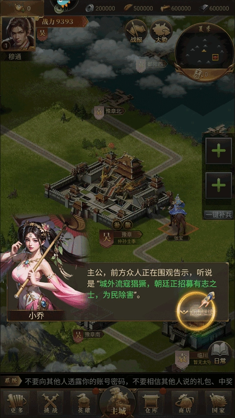 5、黄巾军:每天9、10、15、16点时地图上会随机出现黄巾军,击败可以获得士兵强化道具;每逢第3天19点会出现黄巾大军,击败可以获得元宝