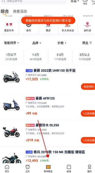 3、点击“新车特卖”板块,即可查看多款新品摩托车的指导价、参数配置等详细信息;