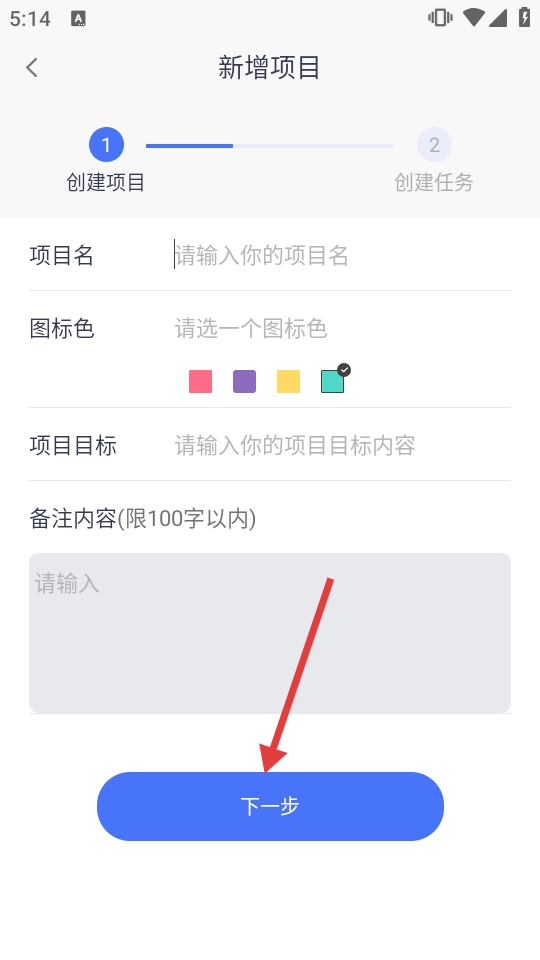 3、进入“创建项目”页面后,依次填写项目名称、挑选图标颜色、录入项目目标与备注信息,随后点击【下一步】按钮,即可跳转至“创建任务”页面。
