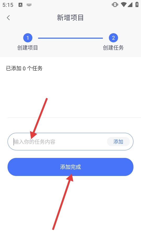 4、进入“创建任务”页面后,填写任务内容,点击【添加完成】按钮,即可完成项目与任务的新增操作。