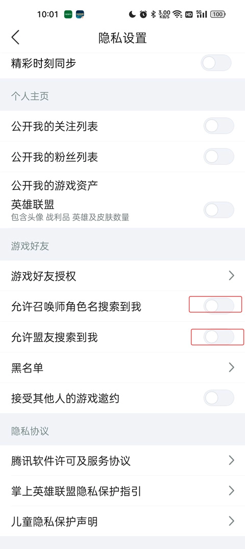 4、在游戏好友列表中找到“允许召唤师搜索到我”和“允许盟友搜索到我”这两个选项,点击关闭它们,这样其他玩家就无法通过搜索找到你并查看你的战绩了。
