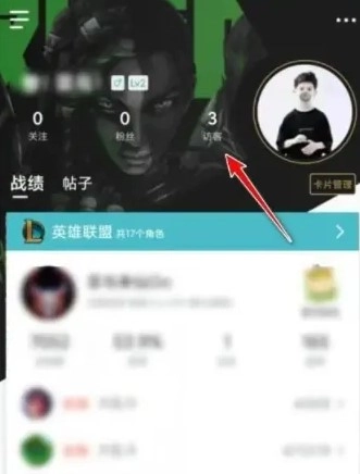 3、进入个人主页后,点击头像旁的箭头,就能进入战绩互动中心,接着点击头像左侧的【访客】选项,即可查看自己的访客记录。