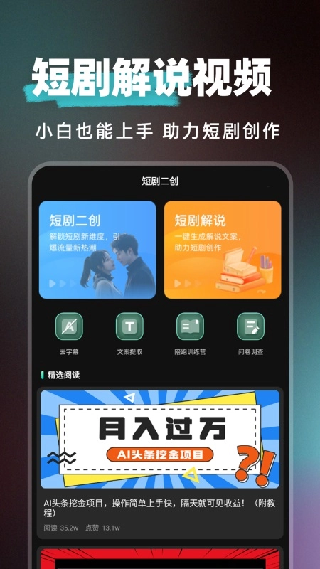 2.进入首页后,能看到短剧二创、短剧解说、去字幕、文案提取等多种功能选项。