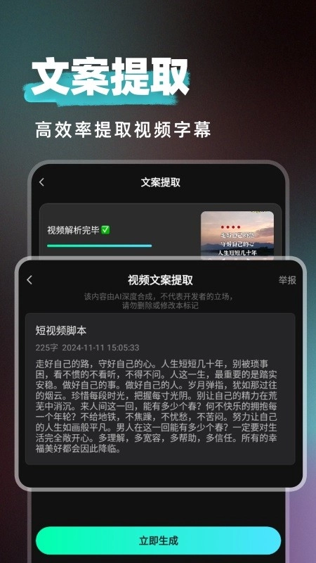 6.文案提取:导入视频后,系统将自动识别并提取视频里的文案内容