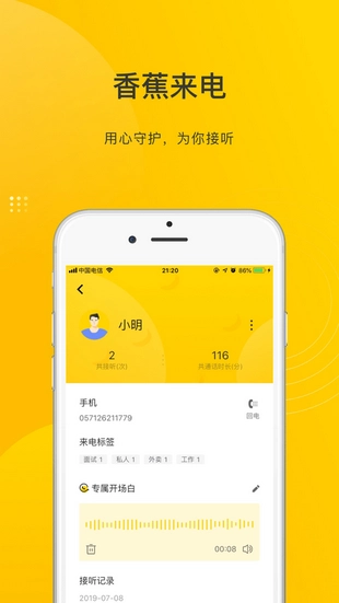 香蕉来电是一款颇受欢迎的手机来电管理应用,你可以获得一个能免费帮你接听电话的智能机器人。它具备丰富的语音来电功能,能智能地帮你管理来电,让你远离骚扰电话。感兴趣的朋友快来体验吧!