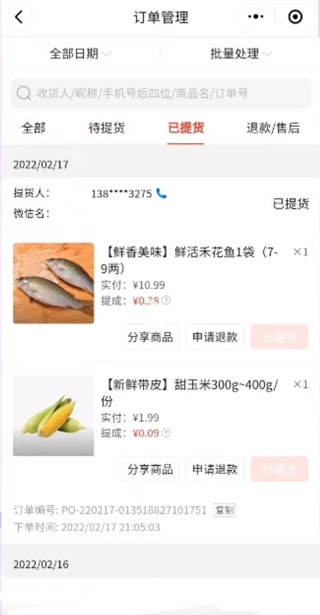4、点击订单管理后,可查看“已提货”“待提货”以及“退款/售后”相关订单。