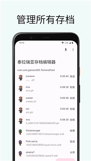 【泰拉瑞亚存档编辑器手机版】作为一款专为游戏《泰拉瑞亚》打造的辅助工具,它能轻松帮你实现存档的编辑操作——无论是新增存档还是删除存档都十分便捷,大幅提升游戏体验。软件采用复古风格设计,支持自动导入存档,可对游戏中的角色、世界与装备等内容进行修改,让你快速获得顶级武器,操作起来非常顺手。同时,它还兼容各类不同的mod,感兴趣的玩家不妨来尝试一下!